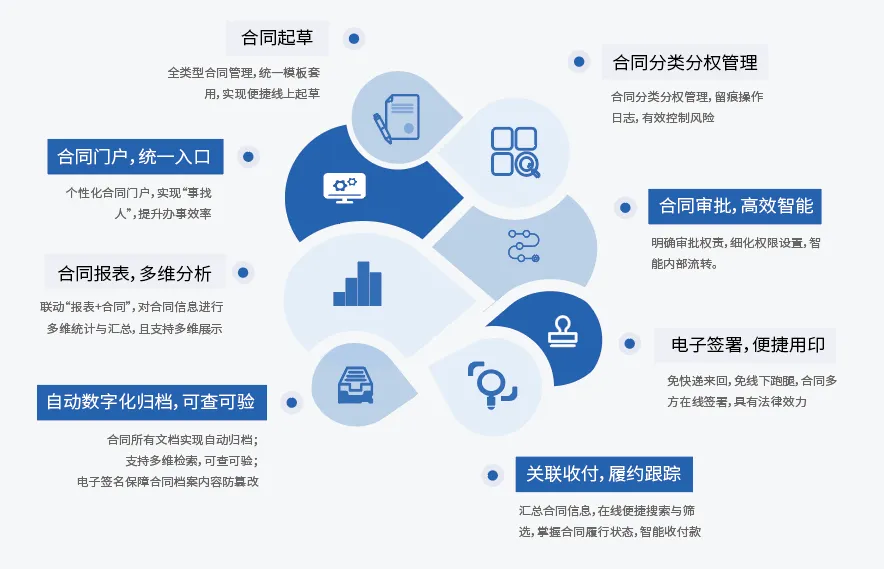 · 统一合同入口。汇总合同报表、审批进度等相关信息;