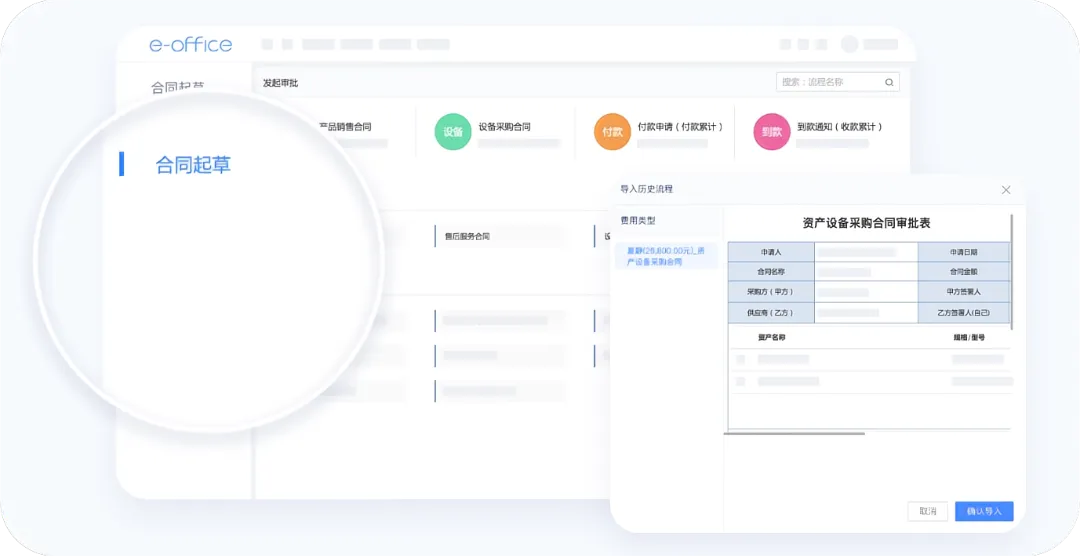 泛微e-office针对全类型合同管理,统一模板套用,实现便捷上线起草。