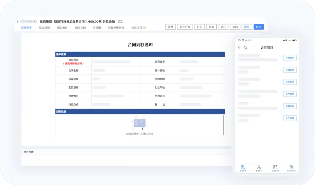 泛微e-office让合同管理融于业务,智能跟踪履约情况。