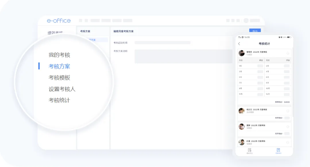 目标管理为纲,激发员工自驱力。泛微e-office以目标为导向,为不同岗位灵活设置考核方案,建立多层级考核体系。年/季/月度考核便捷线上打分,自动统计考核信息,实现全面持续绩效管理。