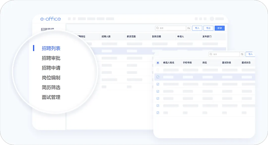 泛微e-office招聘管理对接用人部门与HR,帮助组织高效网聚人才。用人申请线上发起,对接招聘需求给HR,一键生成招聘列表,统一管理各岗位招聘信息、面试信息,跟踪招聘进度、入职情况。