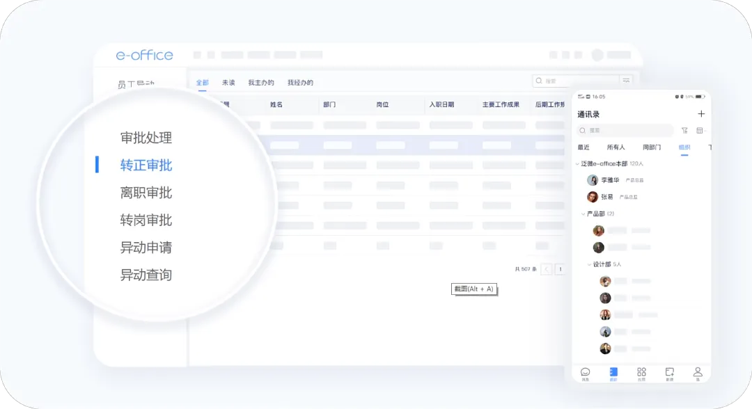 员工异动信息,自动同步组织架构。泛微e-office对企业员工“入职、转正、调岗、离职”等异动行为,实现流程化一体管控。异动信息自动同步组织架构,支持便捷线上查询,减少人事维护成本。