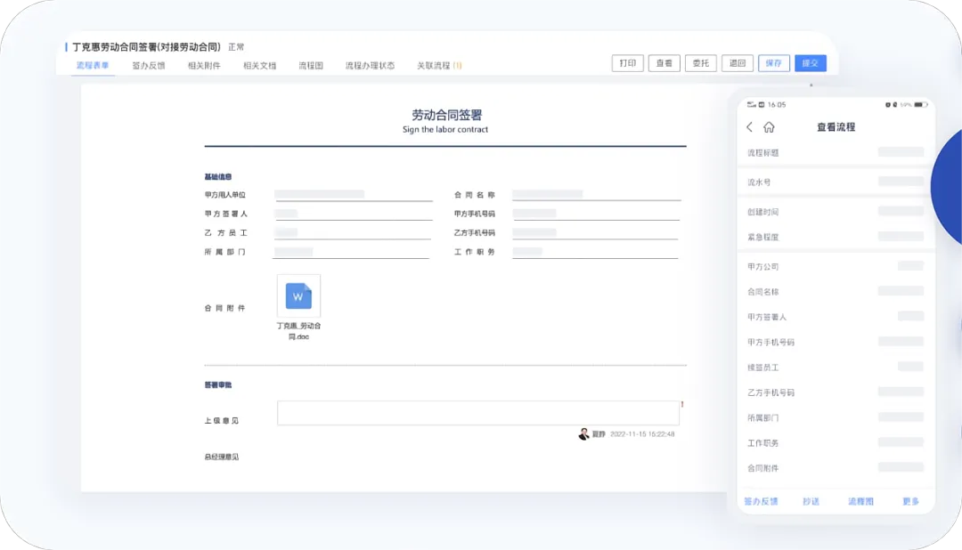 对接甲乙双方,在线合同签署。招聘入职实现合同高效签署,内审流程对接电子签署,实现全程数字化管理。