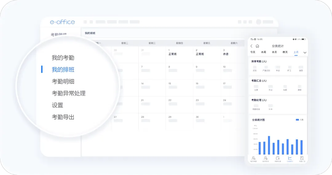 在线考勤、排班,智能生成考勤报表。泛微e-office考勤联动排班,满足企事业单位正常班、夜班、轮岗、外勤等多种打卡需求,自动生成考勤报表,穿透请假、加班、出差等信息,实现智能考勤信息统计。